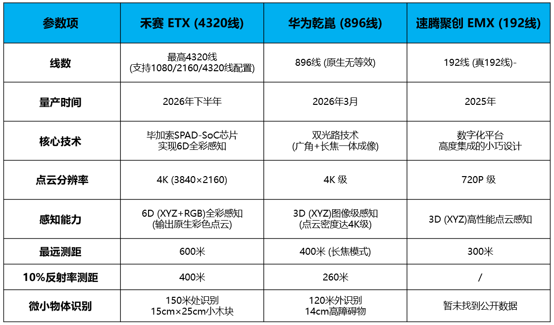 2025年前向主激光雷达市场上,禾赛以41%的份额排名第一,华为以28.3%紧随其后。再加上速腾聚创率先实现了520线数字化激光雷达的量产落地,三者共同构成了高性能激光雷达的“三强”竞争格局。