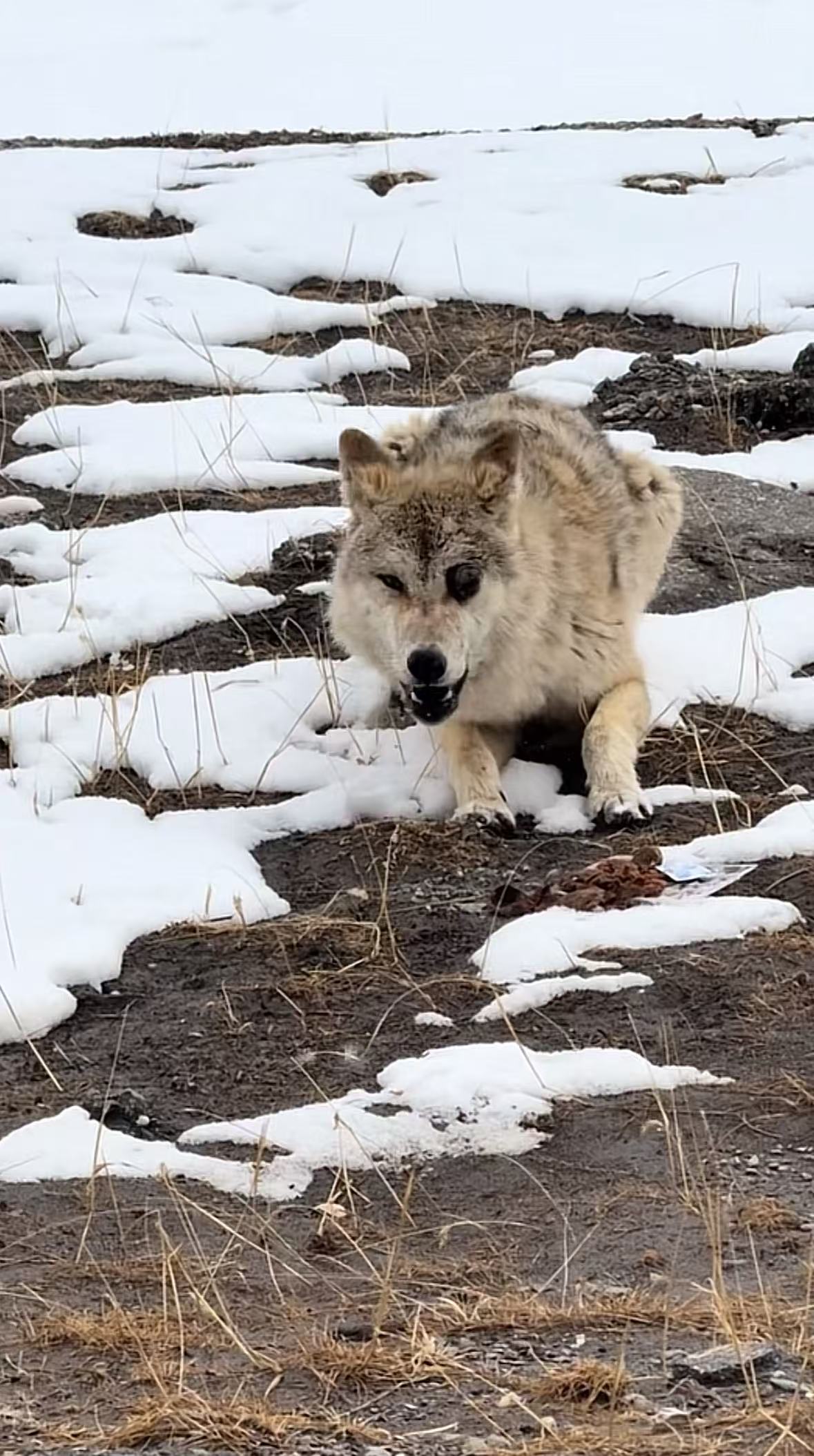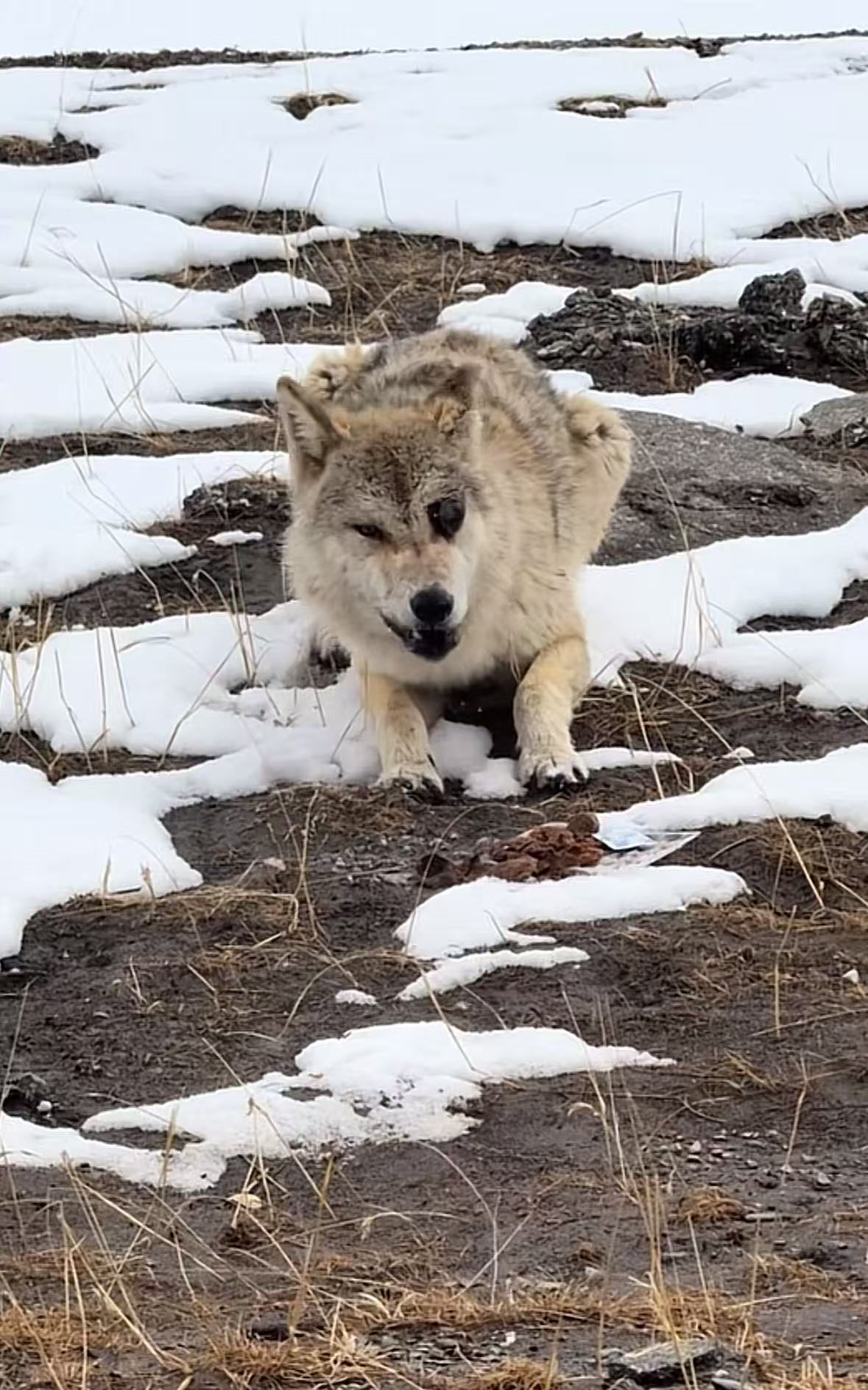 “阿励”说,当天他发现这只狼的时候,赶上可可西里当地正在降雪,他看到这只狼从马路上跑过来,但眼睛和其他狼有明显区别,“我用长焦相机一看,它的眼球直接破了,我估计它是找不到吃的了。”