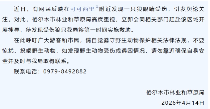格尔木市林业和草原局发出公告正在搜寻受伤“网红狼”