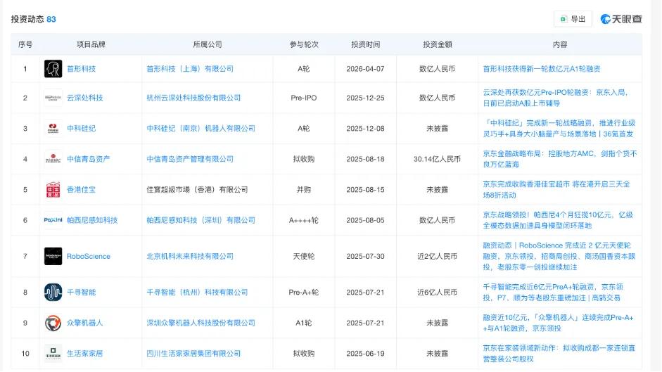 2025年3月下旬,京东创始人刘强东现身香港科技大学参观了多个人工智能项目,并在此后的几个月里,京东进行了猛烈和而短期的机器人投资布局。